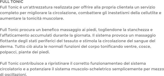 FULL TONICFull Tonic è un’attrezzatura realizzata per offrire alla propria clientela un servizio completo per migliorare la circolazione, combattere gli inestetismi della cellutlite e aumentare la tonicità muscolare. Full Tonic procura un benefico massaggio ai piedi, togliendone la stanchezza e l’affaticamento accumulati durante la giornata. Il sistema provoca un massaggio flottante degli stati periferici del tessuto e stimola la circolazione del sangue del derma. Tutto ciò aiuta le normali funzioni del corpo tonificando ventre, cosce, polpacci, piante dei piedi. Full Tonic contribuisce a ripristinare il corretto funzionamenteo del sistema circolatorio e a potenziare il sistema muscolo-scheletrico semplicemente per mezzo di oscillazioni.